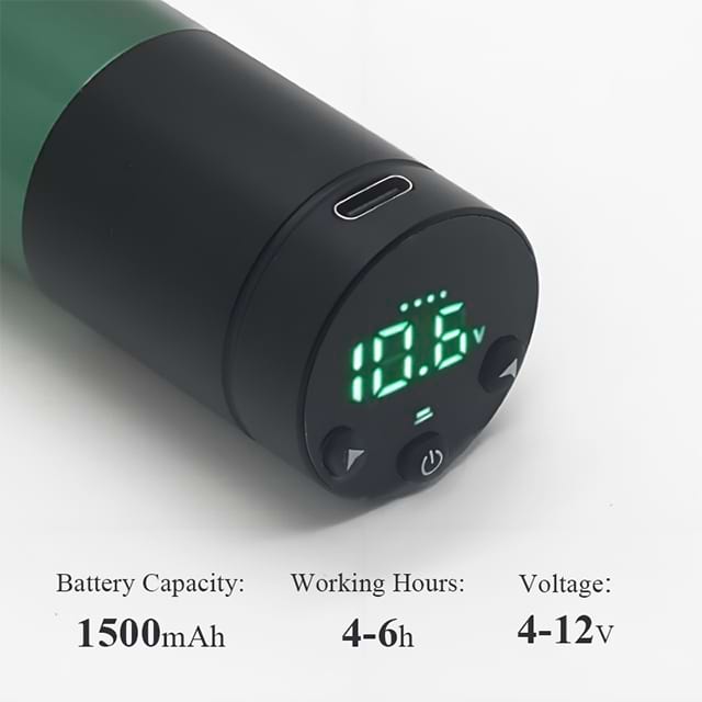 El Uso profesional de tatuaje inalámbrico OEM fusiona el rendimiento de grado industrial con marca personalizable, con un motor de CC sin escobillas (10,000 rpm max) y un Batería de iones de litio de 1800 mAh Eso ofrece más de 5 horas de uso continuo, suficiente para 3–4 sesiones de manga completa.